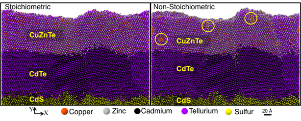 To address this problem, I proposed to develop an interatomic potential for CdTe that included Cu. An interatomic potential was successfully developed by our group in collaboration with Sandia National Laboratories. I used the potential to perform simulations of the incorporation of Cu in polycrystalline CdTe at various Cu loadings. The results showed that the Cu forms clusters only at non-stoichiometric compositions as seen in the yellow circles in Figure 2 where Cu has an excess over the other atoms. However, in the stoichiometric regime, the Cu incorporates mostly by forming CuxTe and does not form clusters [12]. Experimental results were performed by collaborators to validate our simulation results.