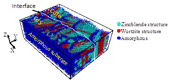 To address this problem, I proposed a method to model the growth of polycrystalline CdTe with no prior assumption of its grain and grain boundary type and evolution. To achieve this, I used MD simulations to grow an amorphous layer of CdTe material. Then, I used this amorphous layer as a substrate to grow polycrystalline material. The result was a “naturally grown” polycrystalline layer on top of the amorphous layer as seen in Figure 1 and which compares very closely to experimental polycrystalline films [8].